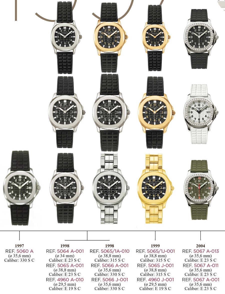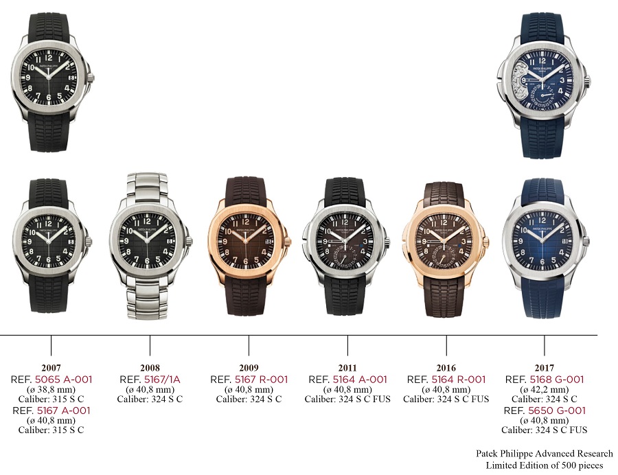 นาฬิการุ่นหลักๆ ของ Aquanaut ตลอด 20 ปีที่ผ่านมา ตั้งแต่เริ่มผลิตรุ่นแรกในปี 1997 จนถึงปัจจุบัน (ปี 2017)