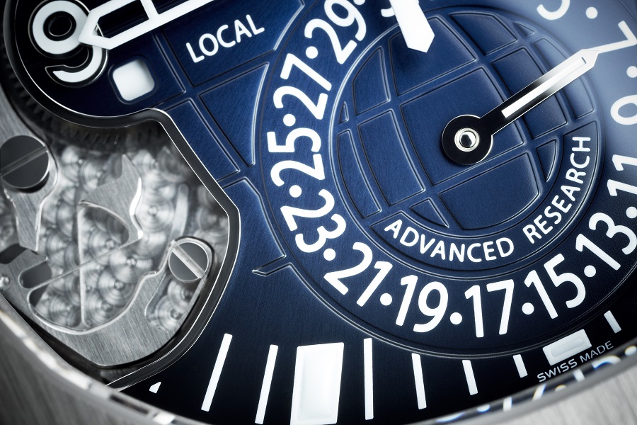หน้าปัดวัสดุทองเหลืองลายตารางหมากรุก เคลือบพีวีดีสีน้ำเงิน ‘ไนท์บลู’ แบบไล่เฉด สว่าง-เข้ม ติดตั้งหลักชั่วโมงเลขอารบิกวัสดุไวท์โกลด์ 18 เค พร้อมเคลือบสารเรืองแสงซูเปอร์ลูมิโนว่า แสดงชั่วโมงกับนาทีด้วยเข็มไวท์โกลด์ 18 เค ทรงบาตองปลายแหลม เคลือบสารเรืองแสงซูเปอร์ลูมิโนว่า แสดงวินาทีด้วยเข็มวัสดุบรอนซ์เคลือบแล็กเกอร์สีขาว แสดงเวลาโฮมไทม์ด้วยเข็มทรงบาตองปลายแหลมฉลุโปร่งวัสดุไวท์โกลด์ 18 เค เคลือบแล็กเกอร์สีขาว แสดงวันที่ด้วยเข็มไวท์โกลด์ 18 เค ทรงบาตองปลายแหลมตกแต่งด้วยขีดแล็กเกอร์สีขาว และเปิดช่องหน้าต่างขนาดใหญ่บนหน้าปัดให้มองเห็นชุดเส้นสปริงไขว้ของกลไกปรับตั้งเวลาทราเวลไทม์ ทั้งยังบ่งบอกความพิเศษด้วยการระบุข้อความ “ADVANCED RESEARCH” ไว้ในวงหน้าปัดวันที่ด้วย