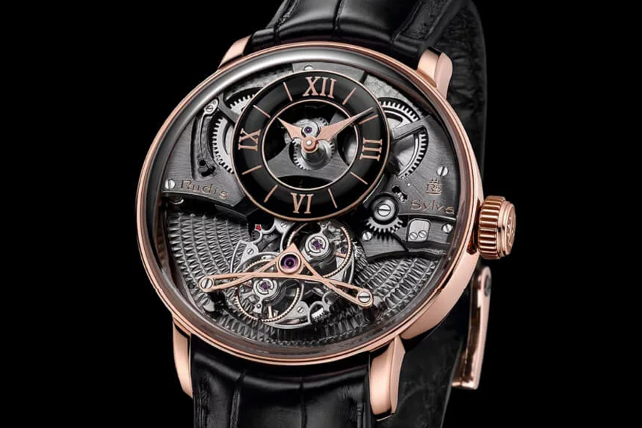 กับนาฬิกาตัวเรือนโรสโกลด์ที่ผ่านการขัดเงาในขนาด 44 มิลลิเมตร หนา 14.3 มิลลิเมตร แกะสลักแท่นกลไกด้านล่างด้วยลวดลายกิโยเช่แบบปิรามิด และแท่นกลไกด้านบนด้วยลวดลายซันเรย์แบบละเอียด พร้อมขอบหน้าปัดเทคนิคกรองฟูว์อีนาเมล ณ ตำแหน่ง 12 นาฬิกา ที่มีความหนานูนในสไตล์ของนาฬิกา จากแนวทางการผลิตจากช่วงปี 1750 ผนวกเข้ากับงานการขัดแต่งลวดลายต่างๆ ตั้งแต่การขัดลวดลายเซอร์กูล่าเกรน การขัดขอบเงาแบบไดมอนด์ และการขัดลวดลายสเนล รวมถึงการขัดขอบของบริจด์ไทเทเนียม