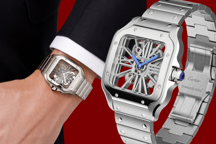 และกับ Santos de CARTIER ในเวอร์ชั่นแบบสเกเลตันตัวเรือนสตีล ซึ่งถือเป็นรูปแบบระดับสูงของนาฬิกาในคอลเลคชั่นนี้พร้อมตัวเรือนสตีลขนาดใหญ่ 39.8 มิลลิเมตร หนา 9.08 มิลลิเมตร ทำงานด้วยกลไกอินเฮ้าส์ไขลานคาลิเบอร์ 9611 MC เม็ดมะยมแบบหกเหลี่ยมประดับแซฟไฟร์สีน้ำเงิน อันอีกหนึ่งในเอกลักษณ์ของนาฬิการุ่นนี้ และเข็มนาฬิกาทรงดาบแบบบลูด์-สตีล พร้อมกระจกแซฟไฟร์ทั้งด้านหน้าและด้านหลัง