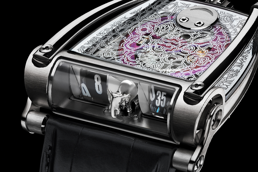 MB&F HM8 Only Watch นาฬิกา HM8 เรือนสุดพิเศษ ‘ยูนีค พีซ’ ที่สร้างขึ้นเพียงเรือนเดียวเพื่อเข้าร่วมประมูลในงานการกุศล ONLY WATCH ประจำปี 2017 ตัวเรือนประกอบขึ้นจากไวท์โกลด์ และไทเทเนี่ยม ร่วมด้วยแผ่นกระจกแซฟไฟร์ที่สลักและเคลือบโลหะ ตกแต่งเป็นลักษณะของภาพวาดจากฝีมือของ Cassandra Legendre ศิลปินวัยรุ่นสาวอายุ 15 ปีผู้มากพรสวรรค์ ทั้งด้านบัลเลท์ และด้านการวาดภาพ โดยภายใต้ลวดลายบนแผ่นกระจกนั้น จะมองเห็นโรเตอร์ที่เคลือบเป็นสีม่วงอยู่รำไร อีกทั้งบริเวณกึ่งกลางระหว่างปริซึมแสดงชั่วโมงกับนาทียังมีการติดตั้งรูปสลักช้างวัสดุไวท์โกลด์ ซึ่งเป็นผลงานของช่างสลักชื่อ Olivier Kuhn โดยนำรูปแบบมาจากช้าง ในภาพวาดของ Cassandra และปิดท้ายความพิเศษด้วยแผ่นเพลทที่ทำเป็นลักษณะของหน้ายิ้ม