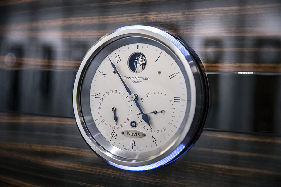 ด้านหน้าประกอบไปด้วยกระจกนิรภัยกันกระสุนหนา 18 มิลลิเมตร ขนาดใหญ่ 2 บาน วางขนาบแถบผนังไม้มาแคสซาร์ลายสวย ซึ่งติดตั้งหน้าปัดแสดงค่า 3 ชุดเรียงตัวในแนวขวาง ที่ประกอบด้วยนาฬิกาแสดงเวลารุ่น Navis 24 ของ ERWIN SATTLER อันเที่ยงตรงและถือเป็นอีกหนึ่งในคล็อครุ่นยอดนิยมของแบรนด์ โดยนาฬิกาแสดงเวลารุ่น Navis 24 นี้จะมีพลังสำรองลานยาวนานถึง 8 วัน ติดตั้งอยู่บริเวณกึ่งกลางของตัวตู้ ซึ่งขนาบซ้ายและขวาด้วยชุดมาตรวัดเทอร์โมมิเตอร์แสดงอุณหภูมิ พร้อมชุดมาตรบารอมิเตอร์แสดงความกดอากาศ ซึ่งทั้งหมดจะผลิตและติดตั้งที่โรงงานของ ERWIN SATTLER เองทั้งสิ้น