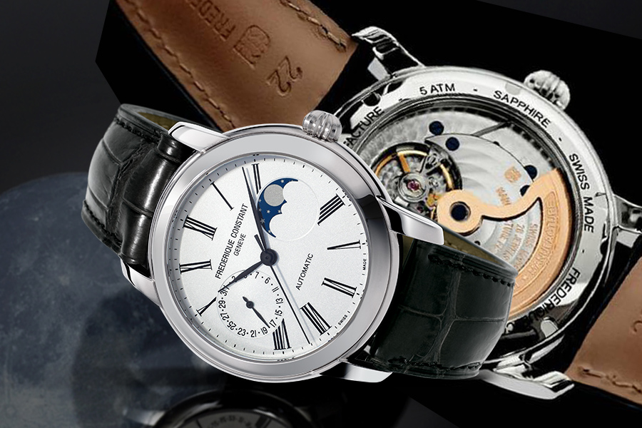 FREDERIQUE CONSTANT รุ่น Classic Moonphase Manufacture เป็นอีกตัวอย่างที่ดีของแบรนด์ ที่นอกจากจะทำงานด้วยกลไกอินเฮ้าส์ของแบรนด์ในลำดับที่ 29 แล้ว ยังมีการพัฒนาให้มีตำแหน่งวงแสดงมูนเฟส ณ 3 นาฬิกา และวงแสดงวันที่ ณ 9 นาฬิกา ในตำแหน่งตรงข้ามกัน อย่างสมมาตร
