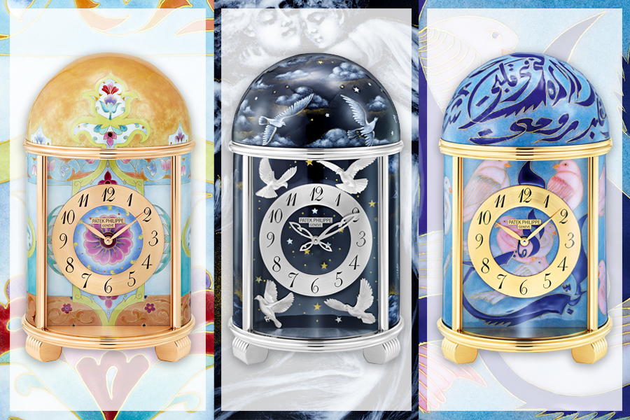 Ref. 20072M “ARABIC CALLIGRAPHY AND DOVES” นาฬิกาคล็อกตั้งโต๊ะแบบโดม ตกแต่งด้วยศิลปะอีนาเมล เทคนิค กรองเฟอ และ คลัวโซนเน เป็นภาพที่ถ่ายทอดมาจากบทกวีของนักเขียนชาวเลบานอนชื่อ Gibran Khalil Gibran ทำงานด้วยกลไกจักรกล คาลิเบอร์ 17’’’ PEND ขึ้นลานด้วยมอเตอร์ไฟฟ้า ผลิตเป็นยูนีกพีซเพียงเรือนเดียว