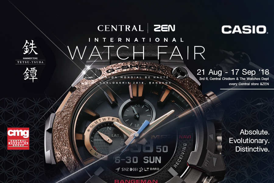 บริษัท เซ็นทรัล มาร์เก็ตติ้ง กรุ๊ป จำกัด (CMG) ผู้นำเข้านาฬิกา CASIO G-SHOCK อย่างเป็นทางการในประเทศไทย เปิดตัวนาฬิกาไฮไลท์ 4 รุ่นสุดเอ็กซ์คลูซีฟ GMW-B5000KL (Full Metal x kolor), MRG-G2000HA “TETSU-TSUBA”, GRAVITYMASTER GR-B100 และ PRO TREK WSD-F20A ในงาน Central International Watch Fair 2018