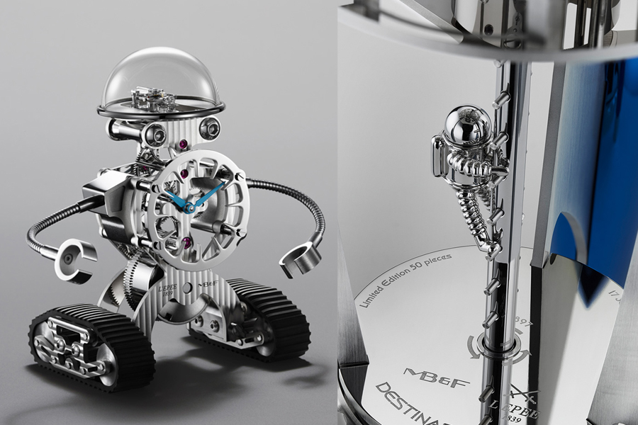 หนึ่งในหลายตัวอย่างที่ต้องเรียกว่าฉีกกฎแนวคิดของวงการนาฬิกาไปไกลทีเดียวก็คือ Destination Moon ที่แม้ว่ายานอวกาศรูปทรงจรวดตอร์ปิโดจากจินตนาการในนิยายวิทยาศาสตร์ยุคทศวรรษที่ 1960 จะไม่ตรงกับลักษณะของยานอวกาศที่มนุษย์สร้างขึ้นใช้จริงเป๊ะๆ แต่ก็ปฏิเสธไม่ได้เลยว่ามีส่วนอย่างยิ่งในการสร้างแรงบันดาลใจให้กับมนุษย์ และจากความประทับใจในจินตนาการนี้ MB&F จึงสร้างสรรค์นาฬิกาคล็อคตั้งโต๊ะตามรูปแบบจรวดเช่นนี้ขึ้นมาโดยตั้งชื่อว่า Destination Moon