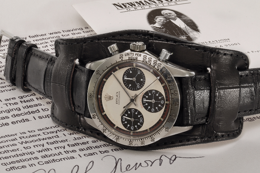 นาฬิกา ROLEX Cosmograph Daytona ‘Paul Newman’ Ref. 6239 เป็นนาฬิกาที่ผลิตขึ้นในปี 1968 ซึ่งเป็นเรือนที่ Paul Newman นักแสดงชื่อดังเป็นเจ้าของ โดยเป็นของขวัญที่ได้รับจาก Joanne Woodward ภรรยาของเขา โดยเธอสั่งให้สลักข้อความแทนความรักและห่วงใยของเธอไว้ว่า “DRIVE CAREFULLY ME” บนฝาหลังของนาฬิกาด้วย (ภาพจาก Phillips สำนักงานการประมูลที่เป็นผู้จัดการประมูลนาฬิกาเรือนนี้เมื่อวันที่ 26 ตุลาคม 2017 ที่นิวยอร์ก ซึ่งเคาะราคาปิดประมูลไปได้ถึง $15.5 ล้าน ซึ่งเมื่อรวมค่าธรรมเนียมแล้ว จะกลายเป็นเงินเป็นจำนวนถึง $17.75 ล้าน)