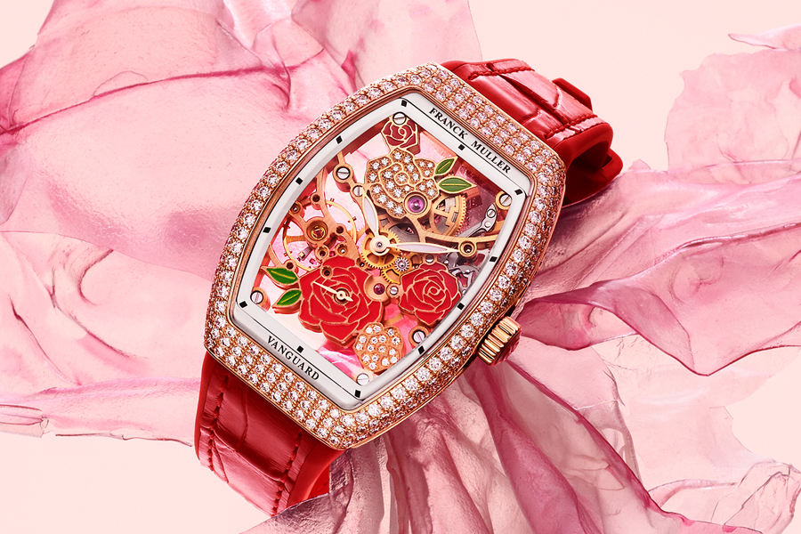 นาฬิกา FRANCK MULLER รุ่น Vanguard™ Rose Skeleton ความงามจากเสน่ห์ของความเป็นผู้หญิง ที่จะช่วยดึงความโรแมนติคด้วยดอกกุหลาบอันละเอียดอ่อน เคียงข้างเพชรที่ทอประกายวิจิตรงดงาม พร้อมความโดดเด่นของดอกกุหลาบและใบไม้ ที่ราวผลิบานตามธรรมชาติท่ามกลางรูปแบบสเกเลตันบนพื้นหน้าปัด ดังนั้นนาฬิกาเรือนนี้จึงเป็นผลงานที่ดึงความงาม อันเป็นเอกลักษณ์ของแบรนด์ออกมาได้อย่างน่าอัศจรรย์