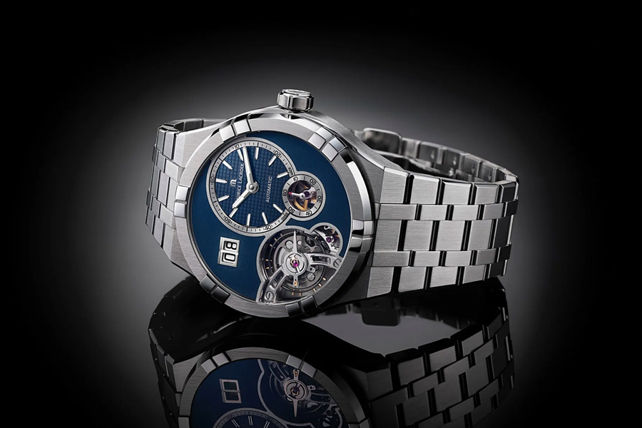 พร้อมโรเตอร์แบบโอเพ่นเวิร์คที่ผ่านการขัดแต่งแบบขัดด้านและลายก้นหอย ในขณะที่เหนือขึ้นไป ณ ตำแหน่ง 10 นาฬิกา มีการจัดวางโมดูลเพื่อแสดงวันที่ขนาดใหญ่ ผ่านช่องหน้าต่างคู่พร้อมเอกลักษณ์เฉพาะหนึ่งเดียวไว้ โดยแทนที่การจัดวางแบบชั้นตามปกติ ซึ่งจะเพิ่มความหนาให้กับกลไก พร้อมการติดตั้งชุดแสดงเวลาวินาทีบนหน้าปัดย่อยแบบเยื้องศูนย์ ซึ่งเป็นแบบเปิดเช่นกัน ณ ตำแหน่ง 4 นาฬิกา นอกจากนี้ยังมีหน้าปัดแสดงเวลาชั่วโมงและนาทีแบบเยื้องศูนย์ที่ผ่านการตกแต่งลวดลายกลูเดอปารีส์ พร้อมกับที่แผ่นหน้าปัดจะตกแต่งด้วยลายเกรนและสายคอร์ดูรา (Cordura®) ในเฉดสีน้ำเงินเข้มอันสง่างาม