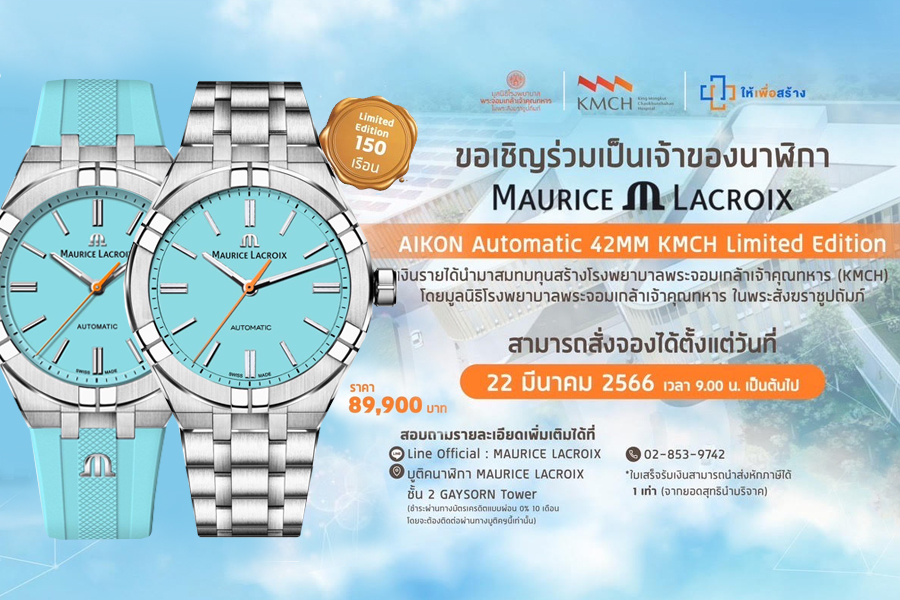นาฬิกา MAURICE LACROIX รุ่น AIKON Automatic 42 mm KMCH Limited Edition จะมีการผลิตในแบบลิมิเต็ดเอดิชั่นจำนวน150 เรือนโดยจะจัดจำหน่ายเฉพาะในประเทศไทย และเริ่มการจำหน่ายในวันพุธที่ 22มีนาคม 2023 (โดยกำหนดการส่งมอบนาฬิกาในช่วงเดือนพฤศจิกายน 2023) ผ่านทาง Line Official ของ MAURICE LACROIX https://lin.ee/TJiSeY7 โดยสามารถขอคิวอาร์โค๊ตเพื่อการโอนเงิน หรือขอลิ๊งค์เพื่อการชำระเงินผ่านทางบัตรเครดิต รวมทั้งสามารถติดต่อได้ที่บูติคนาฬิกา MAURICE LACROIX ชั้น 2 GAYSORN Towerโทร. 02-853-9742 เพื่อชำระเงินผ่านบัตรเครดิตแบบผ่อนชำระ 0% นาน 10 เดือน