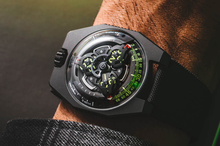 URWERK UR-100 เป็นแนวคิดในเรื่องของอวกาศ อันเกี่ยวเนื่องกับเวลา ที่เป็นคอนเซ็ปท์หลักของแบรนด์มาโดยตลอด กับรูปแบบการแสดงเวลาสไตล์แซทเทิลไลท์ ที่หมุนในสองทิศทาง โดยจะแสดงเวลาชั่วโมงเมื่อชุดเข็มชี้อยู่ที่บริเวณ 4 นาฬิกา และจะกวาดเข็มแสดงเวลานาทีตามสเกล บนขอบด้านล่างของตัวเรือน และนำไปแสดงเวลาสเกล ของการเดินทางหมุนรอบตัวเองของโลกบริเวณ 9.30 ถึง 11.30 นาฬิกา ในขณะที่บริเวณ 12.30 ถึง 2.30 จะเป็นการแสดงเวลาสเกล ของการเดินทางของโลกรอบดวงอาทิตย์