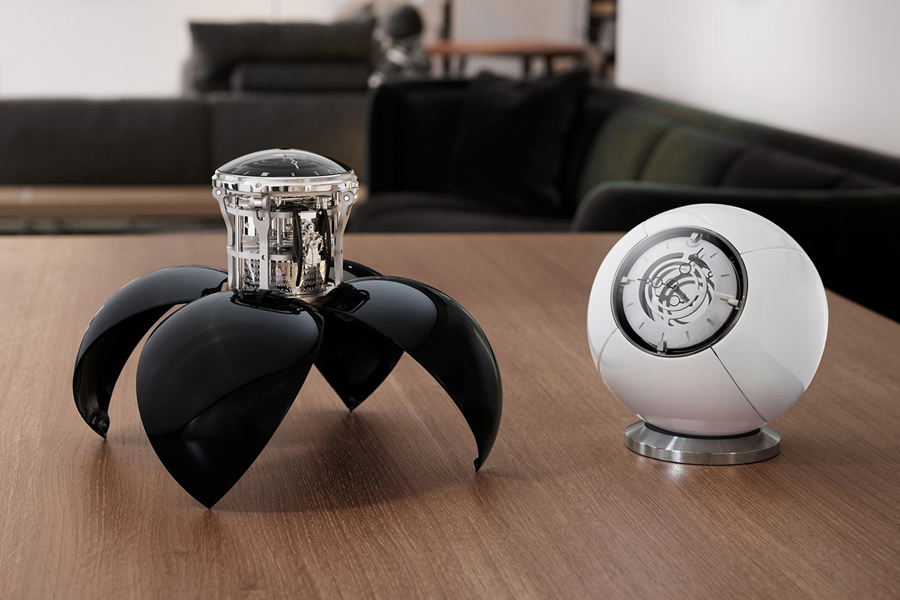 โครงสร้างของนาฬิกาที่เรียบง่ายเรือนนี้ประกอบด้วยฝาครอบทั้งสี่ ที่ไม่เพียงจะเปิดออกได้เท่านั้น แต่ยังสามารถหมุนได้เพื่อแสดง Orb ในตำแหน่งต่างๆ ที่หลากหลาย โดยรุ่นสีขาวแวววาวอาจชวนให้นึกถึง iPod เครื่องแรกที่มีเคสโค้งมนแวววาว พื้นผิวที่สบายตาและน่าสัมผัสเป็นพิเศษ โดยความเป็นไปได้ในการจัดแสดง Orb นั้นมีมากมาย วางบนจานรองแบบไม่เปิดออกหรือเปิดออก วางโชว์แบบตั้งขึ้นหรือจะเปิดฝาครอบบางส่วน หนึ่ง สอง หรือสามตัว หรือจะอีกวิธีหนึ่ง ก็คือการเปิดฝาครอบทั้งสี่โดยไม่ต้องใช้จานรองเลย