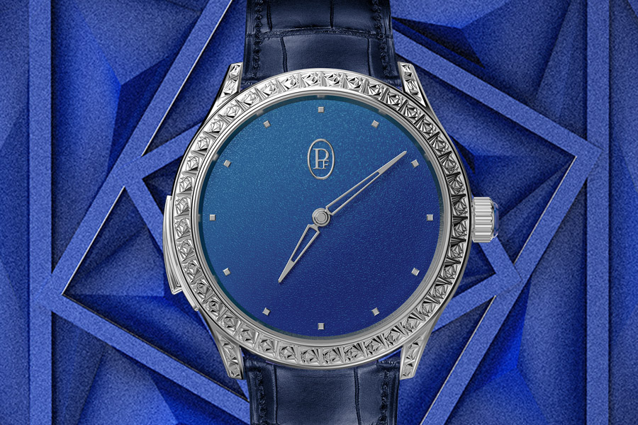 กับชุดกลไกที่ผ่านการขัดแต่งลวดลายโค๊ตส์เดอเชอเนฟ และการขัดแต่งขอบชิ้นส่วน พร้อมทั้งลวดลายเซอร์กูล่าเกรนบนแท่นกลไก โดยบนฝาด้านหลังมีการแกะสลักคำพิเศษต่างๆ ทั้ง Grand feu enamel, Rosa Celeste, “PF” ซีลและลายเซ็นต์ของ Mr. Michel Parmigiani นอกจากนี้ยังมีการแกะสลักซีเรียลนัมเบอร์, คำว่า PARMIGIANI Fleurier, Swiss Made และ Pièce unique ด้วยมือ ในขณะที่หน้าปัดจะมีการแกะสลักลวดลายชีเซลด์ในเนื้องานอีนาเมลแบบกรองฟูว์โทนสีน้ำเงิน และมาร์กเกอร์ที่ผลิตจากไวท์โกลด์ พร้อมกันกับเข็มนาฬิกาที่ผลิตจากทองคำเคลือบโรเดียมทรงเดลต้า และบัคเคิลไวท์โกลด์พร้อมการแกะสลักเช่นกัน