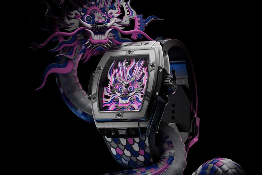 ด้วยแรงบันดาลใจจากศิลปะการตัดกระดาษแบบดั้งเดิมของจีน นาฬิกา Spirit of Big Bang Titanium Dragon ที่ประกอบขึ้นจากชิ้นส่วนต่างๆ ไม่ว่าจะเป็นเข็ม ฟันเฟือง และสกรูว์รูปตัว H เพื่อสร้างภาพร่างสามมิติของมังกรตะวันออก ที่เปิดตัวมาพร้อมกับสายยางดีไซน์แบบมาร์ควิทรี (Marquetry) เป็นครั้งแรก โดยสร้างสรรค์ขึ้นจากความร่วมมือกับศิลปินชาวจีน Chen Fenwan และผลิตในแบบลิมิเต็ดเอดิชั่นเพียง 88 เรือน ที่ถือเป็นการผสมผสานอันสมบูรณ์แบบ ระหว่างขนบธรรมเนียมและความทันสมัย เพื่อสะท้อนสปิริตของ HUBLOT ในเชิงอุปมาผสานสัญลักษณ์ Be First, Unique and Different!