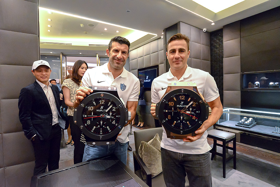 (4 ธันวาคม 2557) พีเอ็มที เดอะ อาวร์กลาส เชิญชวนสื่อมวลชนและคนรักนาฬิกาเข้าร่วมประสบการณ์กระทบไหล่และพบปะสังสรรค์ กับนักฟุตบอลชื่อดังของโลก ฟาบิโอ คันนาวาโร อดีตปราการหลังและกัปตันทีมชาติอิตาลี ชุดคว้าแชมป์ฟุตบอลโลก 2006 เจ้าของสถิติลงรับใช้ทีมชาติอิตาลี มากที่สุดในประวัติศาสตร์ถึง 136 นัด และ หลุยส์ ฟิโก้ อดีตกัปตันทีมชาติโปรตุเกส ในโอกาสที่นักเตะแห่งตำนานทั้งสองมีกำหนดการเข้าเยี่ยมชมบูติกของ Hublot ณ ศูนย์การค้า เซ็นทรัล เอ็มบาสซี
