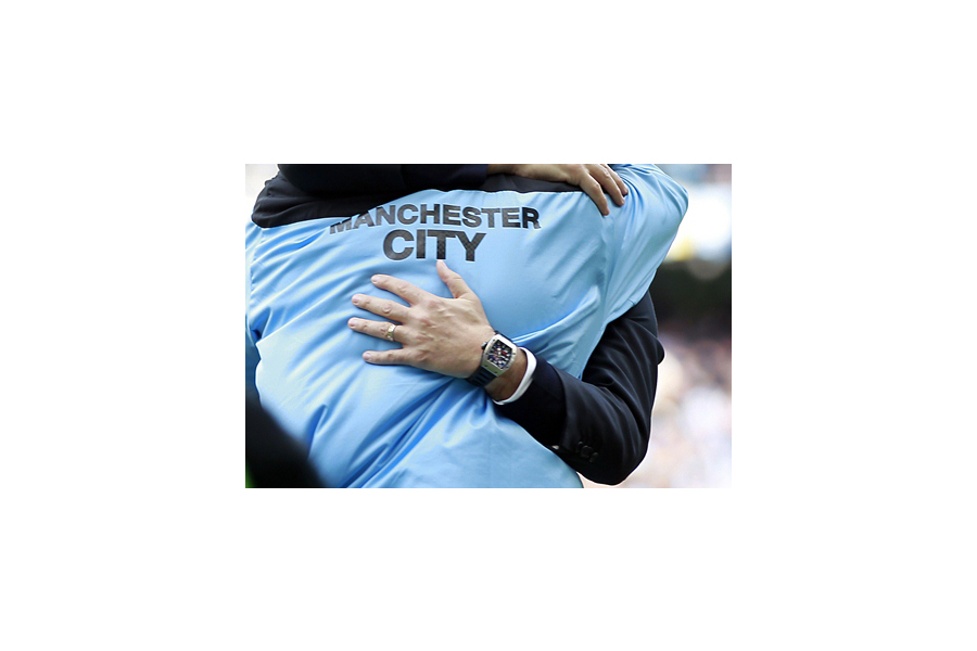 โรแบร์โต มันชินี ผู้จัดการทีม (คนที่สวมนาฬิกา RICHARD MILLE) โอบกอด ไบรอัน คิดด์ ผู้ช่วยของเขา หลังจากที่ Sergio Aguero ทำประตูชัยให้กับทีมได้ในนาทีสุดท้ายของช่วงทดเวลาบาดเจ็บ เอาชนะควีนส์ปาร์ค เรนเจอร์ส ด้วยสกอร์ 3-2 เมื่อเดือนพฤษภาคมที่ผ่านมา พาให้สโมสรแมนเชสเตอร์ ซิตี้ คว้าแชมป์พรีเมียร์ลีก ลีกสูงสุดของอังกฤษ ได้เป็นครั้งแรกในประวัติศาสตร์ 44 ปี ของสโมสรแห่งนี้
