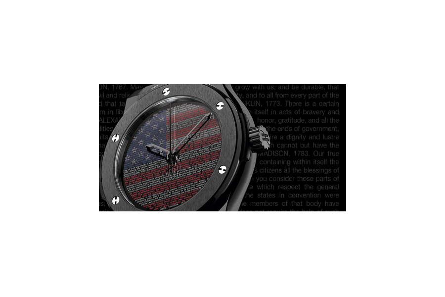 บนแผ่นหน้าปัดของนาฬิกาจะปรากฎข้อความกล่าวสดุดีถึงเหรียญรางวัลอันทรงเกียรติอันเป็นถ้อยความแม่บทแห่งรัฐธรรมนูญและนามของเหล่าประธานาธิบดีในตำนานแห่งสหรัฐอเมริกาท่านต่างๆ กับคุณงามความดีของพวกเขาเรียงร้อยด้วยตัวอักษรสีขาว น้ำเงิน แดง สลับกันบนพื้นดำด้วยเลเซอร์ เรียงรายเป็นภาพธงชาติของสหรัฐอเมริกาอย่างสวยงาม บอกเวลาด้วยเข็มสีดำขัดเงา 3 เข็ม ฉลุกลางบนเข็มชั่วโมงกับนาทีเพื่อมิให้บดบังข้อความบนพื้นหน้าปัด ทำงานด้วยเครื่องอัตโนมัติ บรรจุอยู่ในตัวเรือนแบบคลาสสิกฟิวชั่นที่ทำจากเซรามิกดำ ขนาด 45 มิลลิเมตร ขัดเงาสลับขัดซาติน สวมคู่กับสายยางสีดำที่เย็บประกบด้านนอกด้วยหนังจระเข้สีดำ
