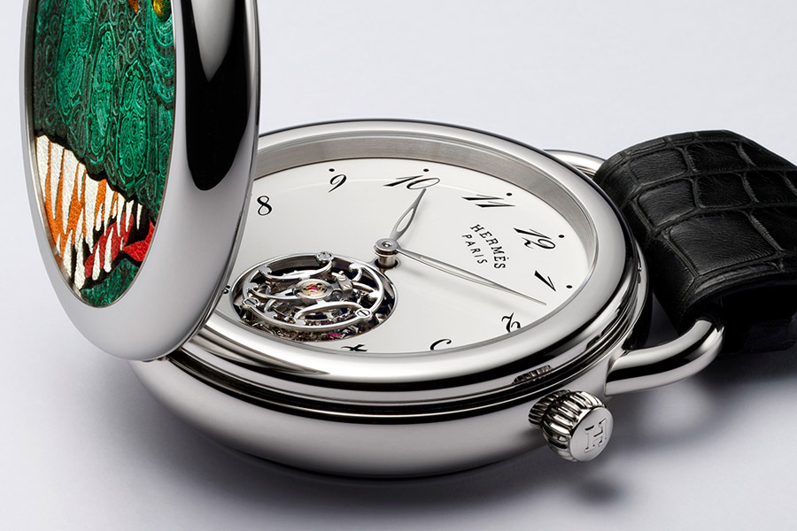 นาฬิกาพกรุ่น Arceau Pocket Aaaaargh! มีความงดงามด้วยหน้าปัดอีนาเมลสีขาวสุดประณีต ผนวกกับฝาครอบชั้นนอกลายไทแรนโนซอรัส จากเทคนิคงานหนังตัดต่อลาย (marquety) และงานหนังเทคนิคโมเสค หลังจากลวดลายหมีห้าวในรุ่น Slim d' HERMÈS Grrrrr! และหมาป่าที่หอนท่ามกลางแสงจันทร์ของนาฬิการุ่น Arceau Awooooo นาฬิกาพกรุ่น Arceau Pocket Aaaaargh! นี้จึงเข้าร่วมกับผลงานจากจินตนาการที่ดีที่สุด โดยศิลปินชาวอังกฤษ กับภาพอ้าปากโชว์ขากรรไกรเพียงครึ่งเดียว และดวงตาดุดันที่ดูราวกับมีชีวิต ภายใต้การทำงานร่วมกันกับ HERMÈS โดยใช้เทคนิคพิเศษที่พัฒนาขึ้น ภายในเวิร์กช้อปเครื่องหนังของแบรนด์