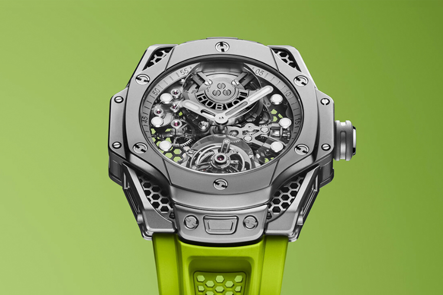 เพื่อเปลี่ยนตัวเรือนนาฬิกาให้กลายเป็นชุดขาวดำสีเทา สำหรับสวมใส่บนสายยางทั้งสามเส้นตั้งแต่สีเขียวสดใสไปจนถึงสีดำ หรือสีขาว พร้อมการนำรายละเอียดต่างๆ มาคิดใหม่อย่างลึกซึ้ง เพื่อยืนยันรูปลักษณ์แบบอินดัสเทรียล ที่ Ross เลือกส่วนประกอบของตัวเรือนนาฬิกาทั้งหมด จากไทเทเนียมไมโครบลาสต์แวววาว ซึ่งขยายไปถึงชุดล็อคซึ่งมีการสลักโลโก้ HUBLOT ด้วยเลเซอร์ พร้อมเม็ดมะยมที่หุ้มด้วยยางสีเทา ในขณะที่ตูร์บิยองบริจด์จะปรากฏในเฉดสีที่เป็นกลาง และทำให้สามารถจับคู่กับสายยางเรียบหนึ่งในสามสายที่มีทั้งสีดำ สีขาว หรือสีเขียวสดใสสไตล์ป๊อปได้อย่างง่ายดาย