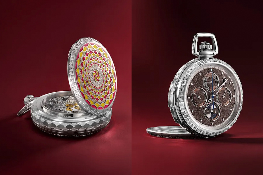 หน้าปัดไวท์โกลด์เทคนิคกรองฟูว์อีนาเมลสีน้ำตาล พร้อมการแกะสลักในธีม L’Armoriale และแผ่นโลโก้ PF แบบประกอบติดกับหน้าปัด และแผ่นมูนเฟสที่ผลิตจากอเวนทูรีน คู่กันกับเข็มไวท์โกลด์ที่ใช้เทคนิคแฮนด์-แฮมเมอร์ด บนตัวเรือนนาฬิกาพกไวท์โกลด์จาก LÉPINE ที่ผ่านการขัดและแกะสลักในธีม L’Armoriale ขนาด 58.2 มิลลิเมตร หนา 17.5 มิลลิเมตร