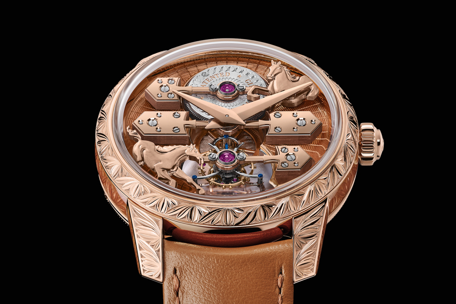 ซึ่งนอกจากหน้าปัดแล้ว ตัวเรือนยังเคลือบด้วยโทนสีในแบบกรองด์ฟูว์สีน้ำผึ้ง อันเป็นเทคนิคในเชิงศิลปะที่ดำเนินการโดย DONZÉ CARDRANS อันเป็นโรงงานในเครือของแบรนด์ ด้วยการใช้เทคนิคชองพลีเว่ (Champlevé) และแต่งแต้มพื้นผิวด้วยเสน่ห์อันไม่ทำให้เกิดการซีดจาง พร้อมด้านหลังของตัวเรือนที่มีการแกะสลักอย่างประณีตด้วยลวดลายร่อง ผนวกเข้ากับลวดลายม้าสามตัวที่พบได้ ในนาฬิกาพกอันเป็นประวัติศาสตร์ที่ลือลั่นของแบรนด์